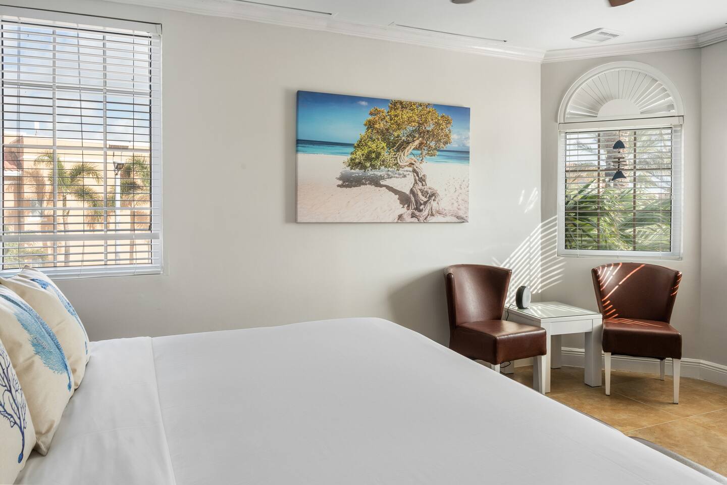 Welcome to your perfect Aruba escape! This spacious and peaceful 1-bedroom condo with resort access is ideal for families, couples, digital nomads, or anyone looking to unwind in tropical comfort. 🛏️ Sleeping Arrangements • 1 King bedroom with ensuite bathroom • 1 Queen-size sofa bed in the living area • 2 full bathrooms for added privacy and comfort • Perfect for families or groups up to 4 guests 🍳 Living & Kitchen • Full-sized, fully equipped kitchen for easy meal prep • 4-seat dining table in the living space • Tastefully decorated living room with a new smart TV • Direct access to a private terrace with extra seating 🏖️ Beach & Resort Perks • Just a 10-minute walk to the famous Eagle Beach • Free use of beach kiosk and loungers *(first come, first served)* • Small cooler provided for beach days *(no glass allowed at beach or pools)* • Close to resort cafés, restaurants, and a nearby casino • 💳 Payment Tip: Most restaurants accept both cash and credit cards, but many bars are card-only and will not accept cash — be sure to bring a card when heading out! 💪 Resort Amenities Included • Swimming pools • Kids Pool with Slide • Fully equipped gym • Tennis courts • Clubhouse with on-site dining • Golf course access *(green fee required; check in with front staff)* 🧺 Housekeeping & Guest Services • Complimentary - daily towel changes and garbage removal • Optional cleaning service- available at $55 per session *(notify us at least 1 day in advance)* • Starter supplies included and restocked weekly or with cleaning service • Beach towels - available—use towel card to pick up and return as needed 📶 Work & Connectivity • Free Wi-Fi • Dedicated workspace—ideal for remote work or long stays 📌 Important Note: Please **notify us in advance** of any changes to your reservation or arrival time. We're always happy to help ensure your stay is smooth and stress-free. ✨ Whether you're here to relax, explore, or work in paradise—this condo offers the perfect balance of comfort, location, and resort luxury. Book now and enjoy everything Aruba has to offer!