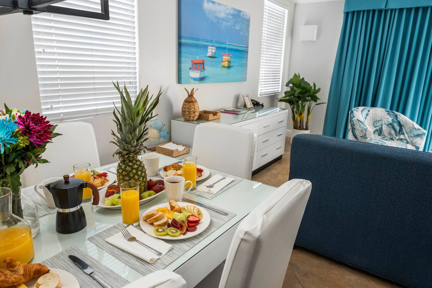 The perfect Aruba accommodation for 6+ people with resort amenities and facilities for a family vacation, couples retreat, remote work or a holiday with friends. This two bedroom unit has 2 closed bedroom with king beds and ensuites, large eat in kitchen, large living area with a sofa-bed (queen-size) and full size bathroom.